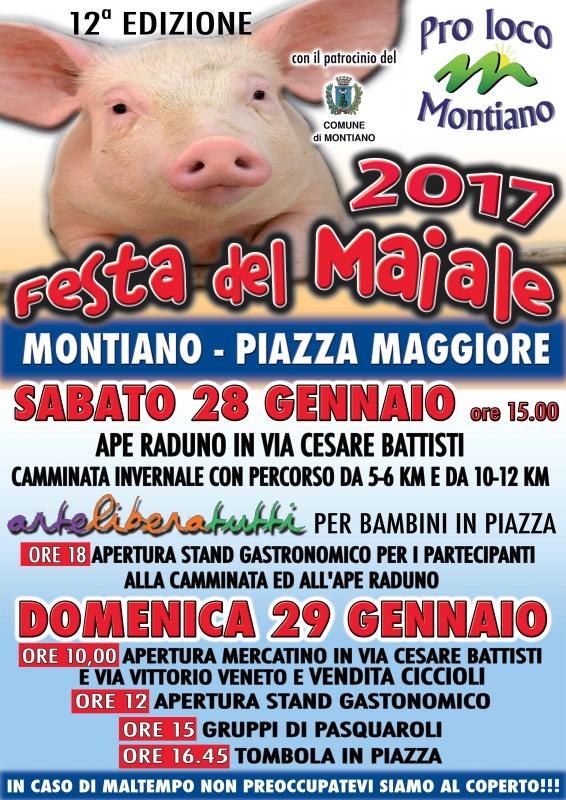 La Pro Loco di Montiano in collaborazione con l'associazione Libera Caccia di Montiano organizza domenica 29 gennaio la 12^ Festa del Maiale.Dalle ore 12 fino alle 20.30 stand gastronomico sotto il tendone. In piazza chiosco con ciccioli e vin brulè e nel pomeriggio si procederà, sotto al tendone, alla dimostrazione della lavorazione della carne del maiale.